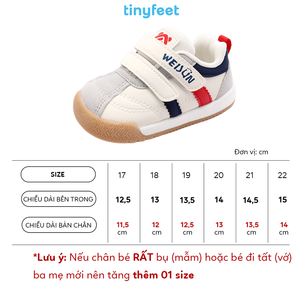 👉 Lưu ý: Ba mẹ nên đo chân bé vào buổi chiều, khi chân có độ giãn tự nhiên, để chọn size chính xác nhất. Nếu chân bé bụ bẫm hoặc bé đi thêm tất (vớ) ba mẹ có thể tăng 01 size để bé đi thoải mái hơn.