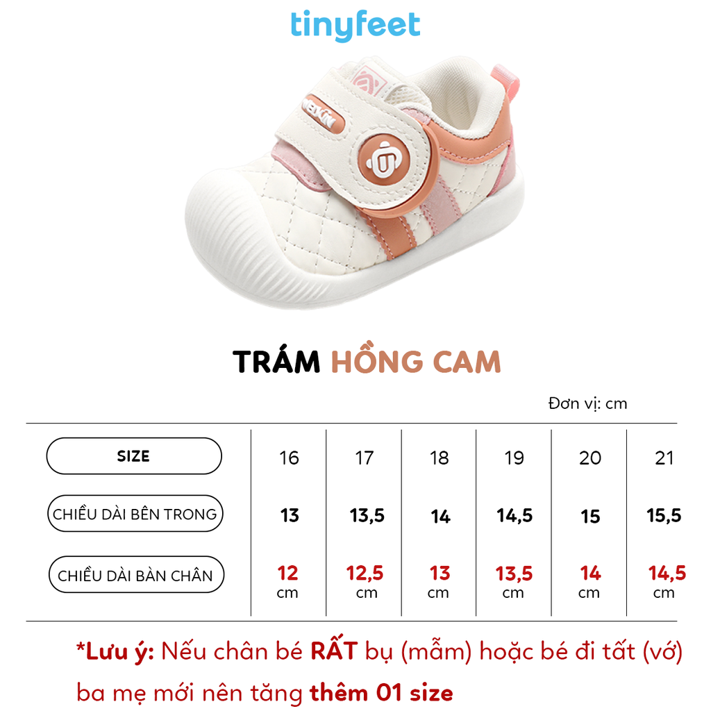 👉 Lưu ý: Ba mẹ nên đo chân bé vào buổi chiều, khi chân có độ giãn tự nhiên, để chọn size chính xác nhất. Nếu chân bé bụ bẫm hoặc bé đi thêm tất (vớ) ba mẹ có thể tăng 01 size để bé đi thoải mái hơn.