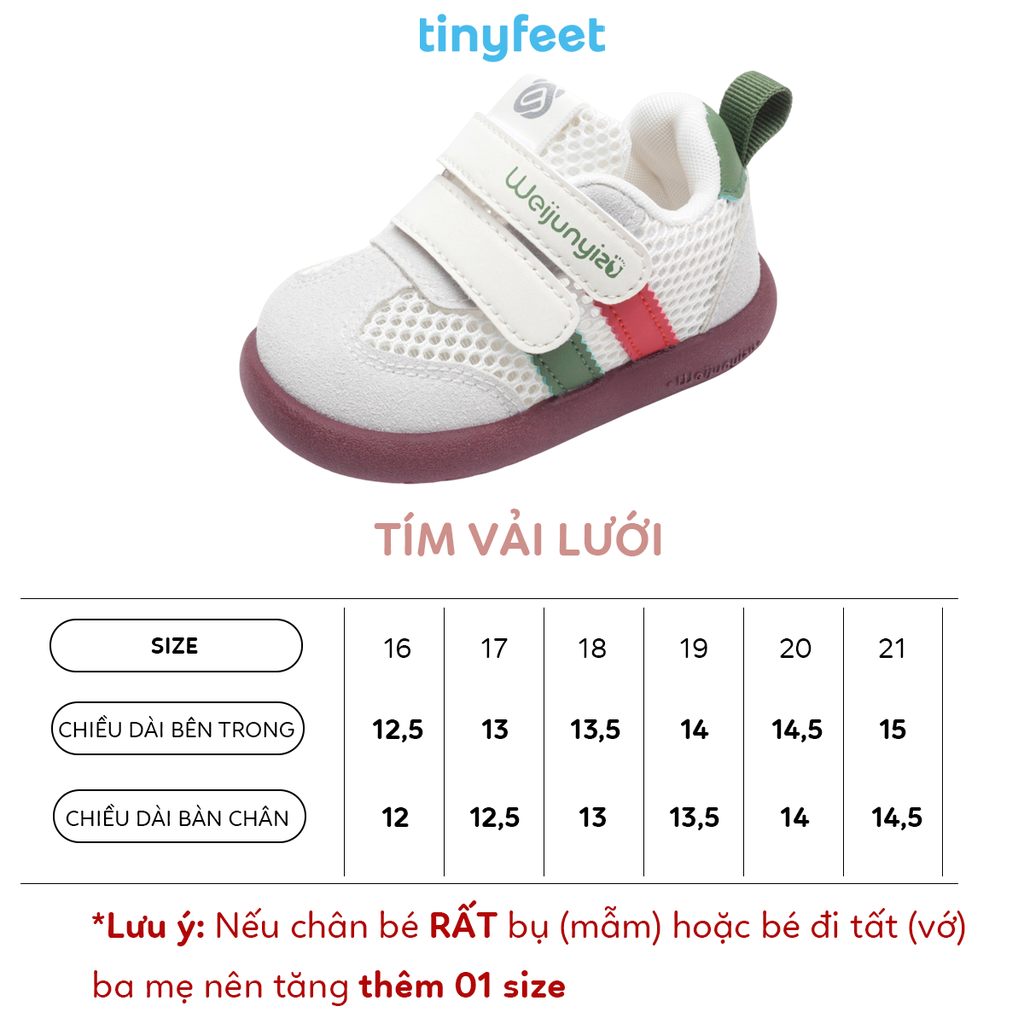 👉 Lưu ý: Ba mẹ nên đo chân bé vào buổi chiều, khi chân có độ giãn tự nhiên, để chọn size chính xác nhất. Nếu chân bé bụ bẫm hoặc bé đi thêm tất (vớ) ba mẹ có thể tăng 01 size để bé đi thoải mái hơn.